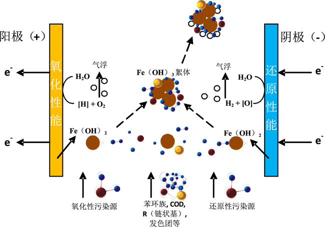 鐵極板受電化學作用析出的Fe2+被氧化成Fe3+和磷酸根反應沉淀,而且能與其它金屬形成共沉淀達到最好的除磷效果。