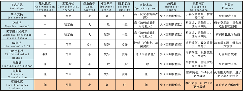 連續高頻脈沖電離膜處理法產生的氫氧化物比藥劑法的活性高,凝聚吸附能力強, 處理效果好,可達到回用水質標準(化學處理法難以達到)。
