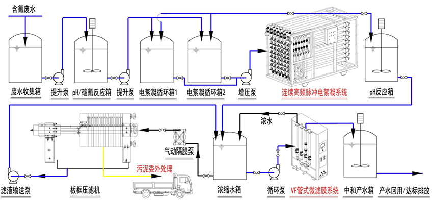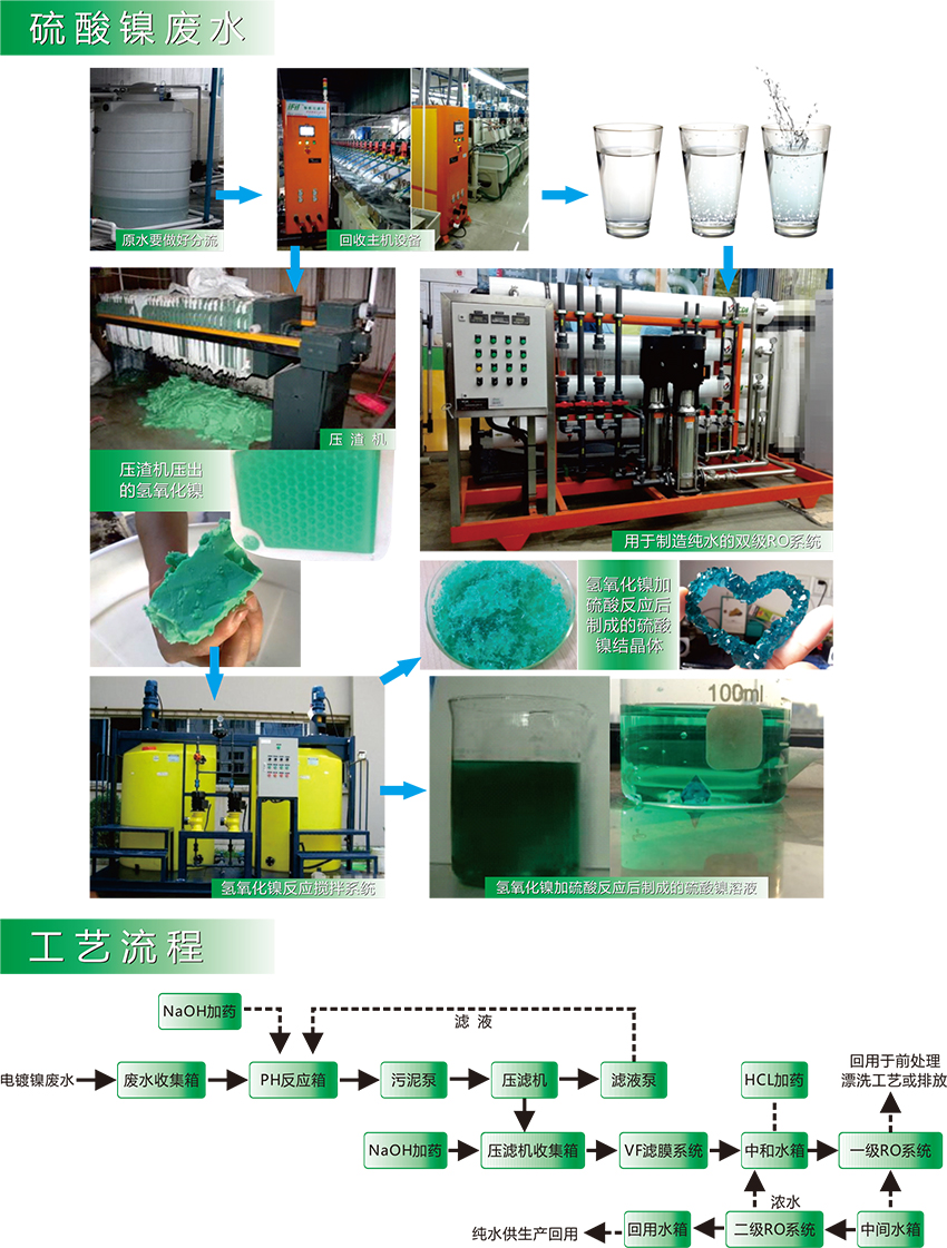 含鎳廢水中的鎳離子屬于一類污染物,必須單獨收集處理,并充分考慮貴重金屬鎳的回收利用。含鎳廢水可分為硫酸鎳廢水和化學廢水。其中,硫酸鎳廢水經過pH調節至堿性后直接流入TMF系統處理,金屬鎳最終轉化為鎳泥實現資源回收;而化學鎳廢水單獨收集后,首先經過連續高頻脈沖電離膜系統處理后在流入TMF系統實現固液分離,壓濾得到的鎳泥經濟價值高。