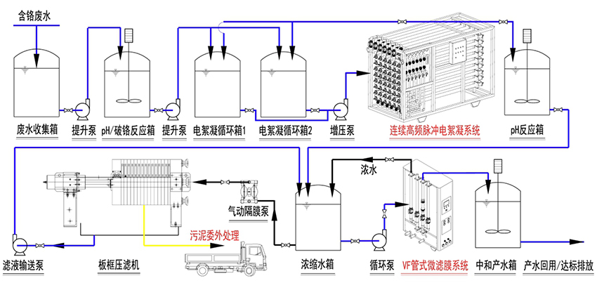 含鉻廢水中的鉻離子屬于一類污染物,必須單獨收集處理,并充分考慮金屬鉻的回收利用。含鉻廢水首先經過連續高頻脈沖電離膜系統處理,將六價鉻還原為三價鉻,并通過pH調節箱沉淀,再流入TMF系統實現固液分離,污泥排外處理。