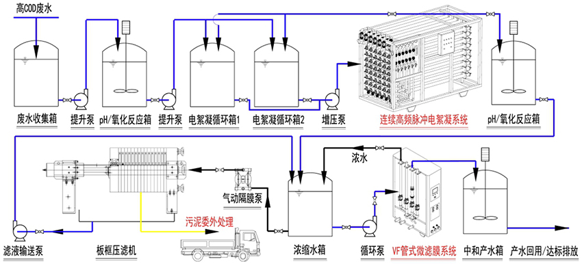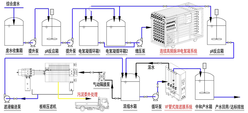 含銅廢水的銅離子屬于一類污染物,必須單獨收集處理,并充分考慮銅的回收利用。含銅廢水可分為普通含銅廢水和絡合含銅廢水。其中,普通含銅廢水經過pH調節至堿性后直接流入TMF系統處理,金屬銅可采用離子交換系統實現資源回收;而絡合銅廢水單獨收集后,首先經過高級氧化系統作預處理,起到了破除銅絡合的作用,接著進入連續高頻脈沖電離膜系統處理后,再流入TMF系統實現固液分離,壓濾得到的銅泥經濟價值高,可回收利用。