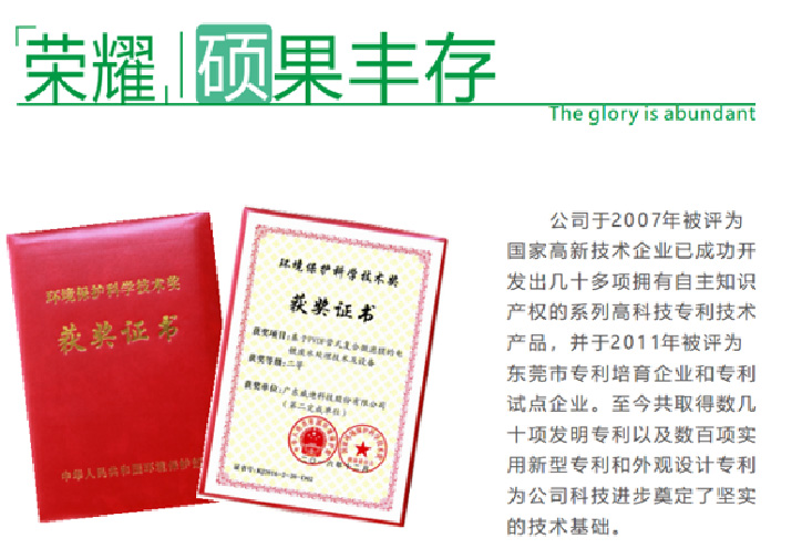 核心設(shè)備已經(jīng)榮獲“國家技術(shù)創(chuàng)新基金立項(xiàng)證書”立項(xiàng)代碼:12C26214405316,并獲得發(fā)明專利的《管式膜污水微濾處理設(shè)備》專利號:ZL 2008 1 0028767.X;威迪公司制造的管式膜也取得了發(fā)明專利《一種固液分離管式微濾膜的制備方法》專利號:ZL201010566336.6;《重金屬處理微濾系統(tǒng)》專利號:ZL 2011 2 0242368.0;榮獲“東莞市2012年度專利獎”;榮獲”廣東省高新技術(shù)產(chǎn)品認(rèn)定證書“,批準(zhǔn)文號: 粵科高字(2011)8號;東莞市科技進(jìn)步獎;獲2016年國家環(huán)保部環(huán)境保護(hù)技術(shù)獎。