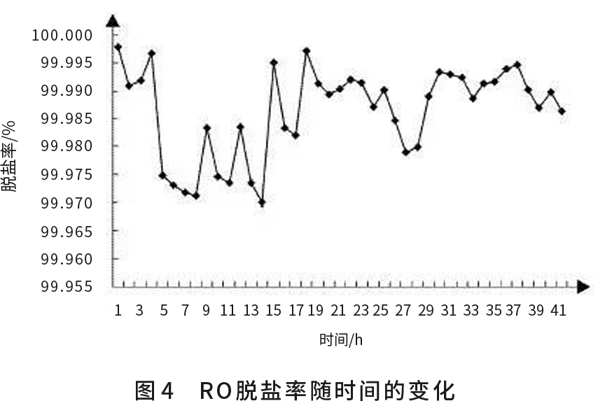 圖4為RO脫鹽率隨時間之間的關(guān)系圖,可以看出,RO膜的脫鹽率很高,基本在99。96%以上。原水中溶解性雜質(zhì)透過膜的百分率,計算公式為:SP=100%×(Cp/Cfm)(1)
