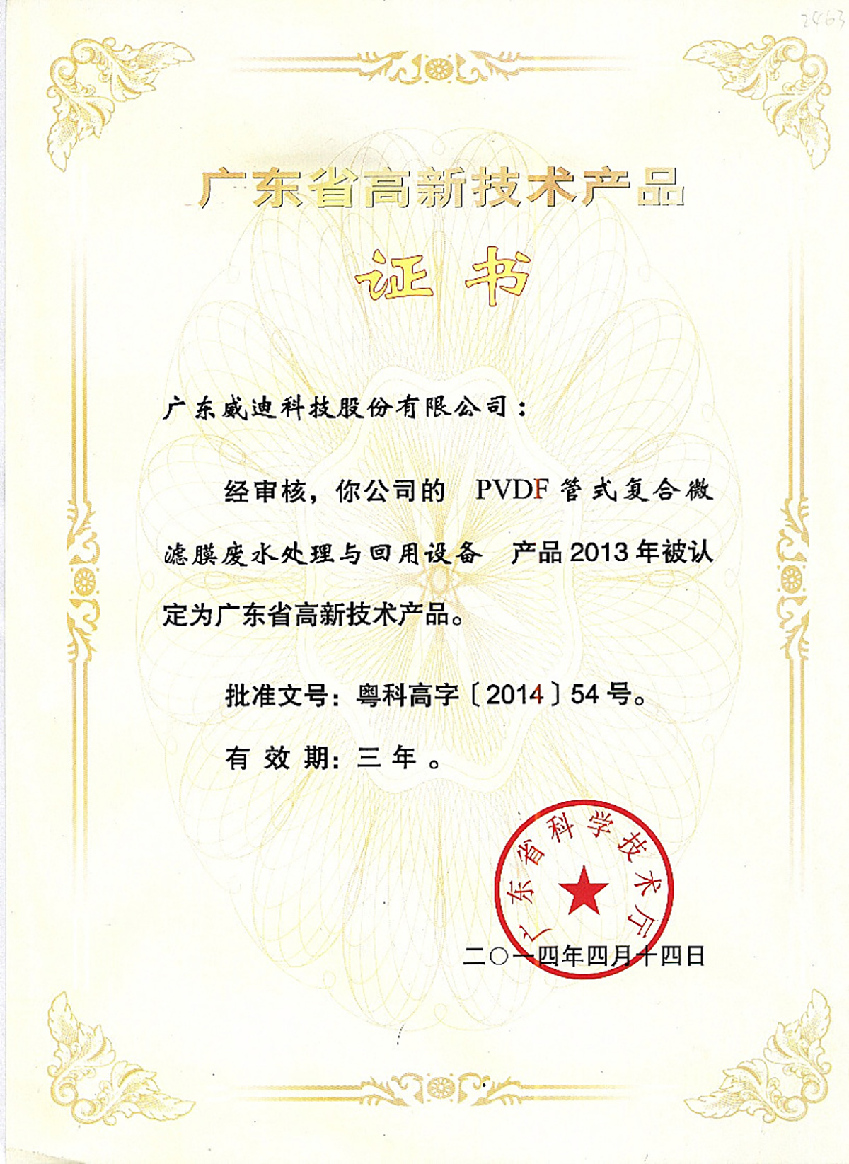 2013年廣東省高新技術產品-PVDF管式復合微濾膜廢水處理與回用系統